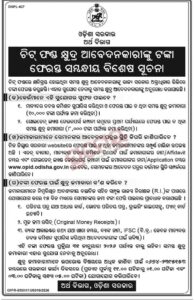 ଭୁବନେଶ୍ୱର ୨୨।୧୨ : ଚିଟଫଣ୍ଡକୁ ନେଇ ରାଜ୍ୟ ସରକାରଙ୍କ ତତ୍ପରତା। ଟଙ୍କା ଫେରସ୍ତ ପାଇବେ କ୍ଷୁଦ୍ର ଚିଟ୍ ଫଣ୍ଡ୍ ଜମାକାରୀ। ଏନେଇ ଅର୍ଥ ବିଭାଗ ପକ୍ଷରୁ ପ୍ରକାଶ ପାଇଲା ବିଜ୍ଞପ୍ତି। ଏହାର ସୁଯୋଗ ନେବାକୁ ସମସ୍ତ ଆବେଦନକାରୀଙ୍କୁ ଅନୁରୋଧ କରାଯାଇଛି।|