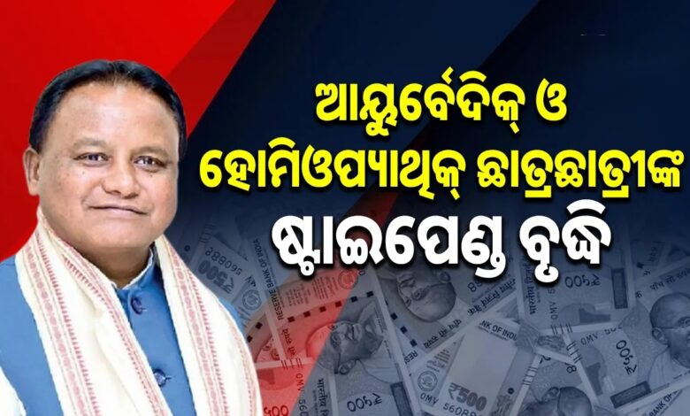 ସରକାରୀ ଆୟୁର୍ବେଦିକ୍ ଓ ହୋମିଓପ୍ୟାଥିକ୍ ଛାତ୍ରଛାତ୍ରୀଙ୍କ stipend ବୃଦ୍ଧି କଲେ ମୁଖ୍ୟମନ୍ତ୍ରୀ ମୋହନ ଚରଣ ମାଝୀ। ଛାତ୍ରଛାତ୍ରୀମାନଙ୍କୁ ପ୍ରୋତ୍ସାହିତ କରିବା ପାଇଁ ମୁଖ୍ୟମନ୍ତ୍ରୀ ଏହି ନିଷ୍ପତ୍ତି ନେଇଛନ୍ତି ।