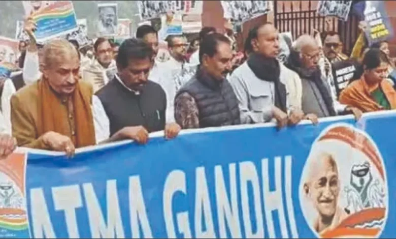 ଗ୍ରାମୀଣ ନିଯୁକ୍ତ ଯୋଜନାରୁ ମହାତ୍ମା ଗାନ୍ଧୀଙ୍କ ନାଁ ହଟାଇବା ବିରୋଧରେ ଆଜି ବିରୋଧୀ ସାଂସଦମାନେ ଲଗାତାର ସ୍ଲୋଗାନ ଦେଇ ହଟ୍ଟଗୋଳ ଜାରି ରଖିଥିଲେ। ସେମାନେ ବିଲ୍ର କପି ଚିରି ଏହାକୁ ବାଚସ୍ପତିଙ୍କ ଆସନ ଆଡ଼କୁ ଫୋପାଡ଼ିବାରୁ ହଙ୍ଗାମା ବଢ଼ିଥିଲା। ଅନ୍ୟପକ୍ଷେ ଆଜି ବିରୋଧୀ ସାଂସଦମାନେ ବିଲ୍ ପ୍ରତ୍ୟାହାର ଦାବିରେ ସଂସଦ ଭବନ ପରିସରରେ ମଧ୍ୟ ବିକ୍ଷୋଭ ପ୍ରଦର୍ଶନ କରିଥିଲେ। କଂଗ୍ରେସ ସଭାପତି ମଲ୍ଲିକାର୍ଜୁନ ଖଡ଼ଗେ ଏହି ବିଲ୍ ଗାନ୍ଧୀଜୀଙ୍କ ପ୍ରତି ଏବଂ କାମ କରିବାର ଅଧିକାର ପ୍ରତି ଏକ ଅପମାନ ବୋଲି କହିଛନ୍ତି। ମକର ଦ୍ବାରରେ ଆଜି ବିରୋଧୀ ସାଂସଦମାନେ ବିକ୍ଷୋଭ ପ୍ରଦର୍ଶନ କରିବା ସମୟରେ ବରିଷ୍ଠ କଂଗ୍ରେସ ନେତ୍ରୀ ସୋନିଆ ଗାନ୍ଧୀ ମଧ୍ୟ ଯୋଗ ଦେଇଥିଲେ।